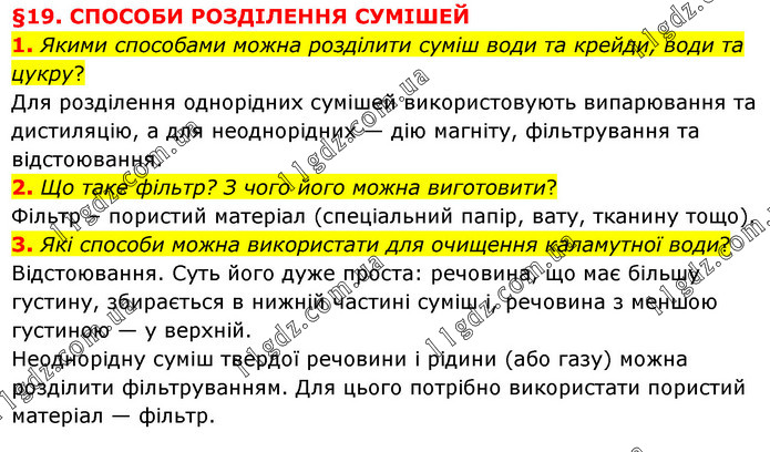 §19. СПОСОБИ РОЗДІЛЕННЯ СУМІШЕЙ 1. Якими способами можна розділити суміш води та крейди, води та цукру? Для розділення однорідних сумішей використовують випарювання та дистиляцію, а для неоднорідних — дію магніту, фільтрування та відстоювання. 2. Що таке фільтр? З чого його можна виготовити? Фільтр – пористий матеріал (спеціальний папір, вату, тканину тощо). 3. Які способи можна використати для очищення каламутної води? Відстоювання. Суть його дуже проста: речовина, що має більшу густину, збирається в нижній частині суміш і, речовина з меншою густиною — у верхній. Неоднорідну суміш твердої речовини і рідини (або газу) можна розділити фільтруванням. Для цього потрібно використати пористий матеріал — фільтр.