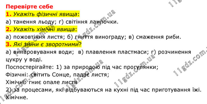 Перевірте себе 1. Укажіть фізичні явища: а) танення льоду; г) світіння лампочки. 2. Укажіть хімічні явища: а) пожовтіння листя; б) гниття винограду; в) смаження риби. 3. Які зміни є зворотними? а) випаровування води; в) плавлення пластмаси; г) розчинення цукру у воді. Поспостерігайте: 1) за природою під час прогулянки; Фізичні: світить Сонце, падає листя; Хімічні: гниє опале листя 2) за процесами, які відбуваються на кухні під час приготування їжі. Хімічне.