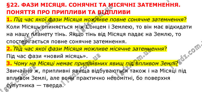 §22. ФАЗИ МІСЯЦЯ. СОНЯЧНІ ТА МІСЯЧНІ ЗАТЕМНЕННЯ. ПОНЯТТЯ ПРО ПРИПЛИВИ ТА ВІДПЛИВИ 1. Під час якої фази Місяця можливе повне сонячне затемнення? Коли Місяць опиняється між Сонцем і Землею, то він має відкидати на нашу планету тінь. Якщо тінь від Місяця падає на Землю, то спостерігається повне сонячне затемнення. 2. Під час якої фази Місяця можливе місячне затемнення? Під час фази «новий місяць». 3. Чому на Місяці немає припливних явищ під впливом Землі? Звичайно ж, припливні явища відбуваються також і на Місяці під впливом Землі, але вони практично непомітні, бо поверхня супутника — тверда.