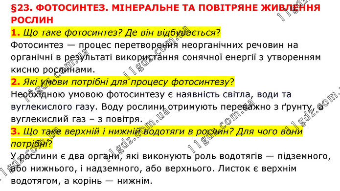 §23. ФОТОСИНТЕЗ. МІНЕРАЛЬНЕ ТА ПОВІТРЯНЕ ЖИВЛЕННЯ РОСЛИН 1. Що таке фотосинтез? Де він відбувається? Фотосинтез — процес перетворення неорганічних речовин на органічні в результаті використання сонячної енергії з утворенням кисню рослинами. 2. Які умови потрібні для процесу фотосинтезу? Необхідною умовою фотосинтезу є наявність світла, води та вуглекислого газу. Воду рослини отримують переважно з ґрунту, а вуглекислий газ – з повітря. 3. Що таке верхній і нижній водотяги в рослин? Для чого вони потрібні? У рослини є два органи, які виконують роль водотягів — підземного, або нижнього, і надземного, або верхнього. Листок є верхнім водотягом, а корінь — нижнім.