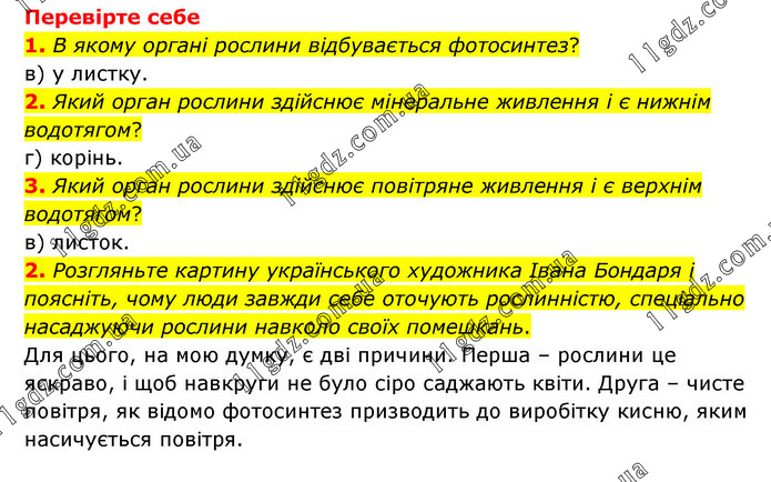 Перевірте себе 1. В якому органі рослини відбувається фотосинтез? в) у листку. 2. Який орган рослини здійснює мінеральне живлення і є нижнім водотягом? г) корінь. 3. Який орган рослини здійснює повітряне живлення і є верхнім водотягом? в) листок. 2. Розгляньте картину українського художника Івана Бондаря і поясніть, чому люди завжди себе оточують рослинністю, спеціально насаджуючи рослини навколо своїх помешкань. Для цього, на мою думку, є дві причини. Перша – рослини це яскраво, і щоб навкруги не було сіро саджають квіти. Друга – чисте повітря, як відомо фотосинтез призводить до виробітку кисню, яким насичується повітря.