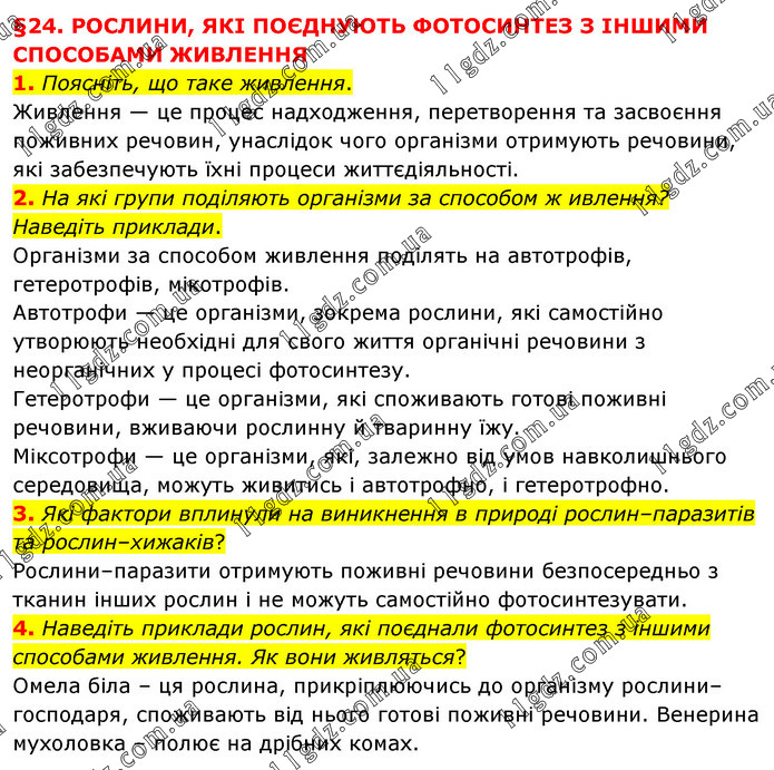 §24. РОСЛИНИ, ЯКІ ПОЄДНУЮТЬ ФОТОСИНТЕЗ З ІНШИМИ СПОСОБАМИ ЖИВЛЕННЯ 1. Поясніть, що таке живлення. Живлення — це процес надходження, перетворення та засвоєння поживних речовин, унаслідок чого організми отримують речовини, які забезпечують їхні процеси життєдіяльності. 2. На які групи поділяють організми за способом ж ивлення? Наведіть приклади. Організми за способом живлення поділять на автотрофів, гетеротрофів, мікотрофів. Автотрофи — це організми, зокрема рослини, які самостійно утворюють необхідні для свого життя органічні речовини з неорганічних у процесі фотосинтезу. Гетеротрофи — це організми, які споживають готові поживні речовини, вживаючи рослинну й тваринну їжу. Міксотрофи — це організми, які, залежно від умов навколишнього середовища, можуть живитись і автотрофно, і гетеротрофно. 3. Які фактори вплинули на виникнення в природі рослин–паразитів та рослин–хижаків? Рослини–паразити отримують поживні речовини безпосередньо з тканин інших рослин і не можуть самостійно фотосинтезувати. 4. Наведіть приклади рослин, які поєднали фотосинтез з іншими способами живлення. Як вони живляться? Омела біла – ця рослина, прикріплюючись до організму рослини–господаря, споживають від нього готові поживні речовини. Венерина мухоловка – полює на дрібних комах.