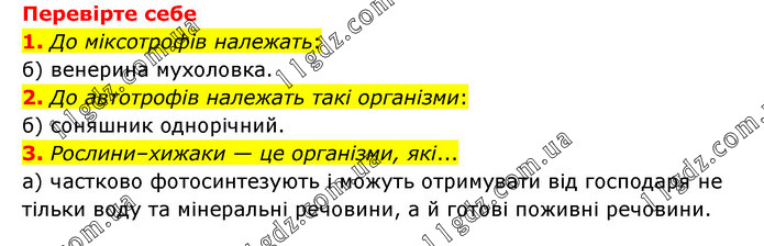 Перевірте себе 1. До міксотрофів належать: б) венерина мухоловка. 2. До автотрофів належать такі організми: б) соняшник однорічний. 3. Рослини–хижаки — це організми, які... а) частково фотосинтезують і можуть отримувати від господаря не тільки воду та мінеральні речовини, а й готові поживні речовини.