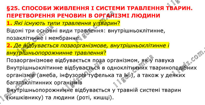 §25. СПОСОБИ ЖИВЛЕННЯ І СИСТЕМИ ТРАВЛЕННЯ ТВАРИН. ПЕРЕТВОРЕННЯ РЕЧОВИН В ОРГАНІЗМІ ЛЮДИНИ 1. Які існують типи травлення у тварин? Відомі три основні види травлення: внутрішньоклітинне, позаклітинне і мембранне. 2. Де відбувається позаорганізмове, внутрішньоклітинне і внутрішньопорожнинне травлення? Позаорганізмове відбувається поза організмом, як у павука Внутрішньоклітинне відбувається в одноклітинних твариноподібних організмів (амеба, інфузорія туфелька та ін.), а також у деяких багатоклітинних організмів Внутрішньопорожнинне відбувається у травній системі тварин (кишківнику) та людини (роті, кишці).