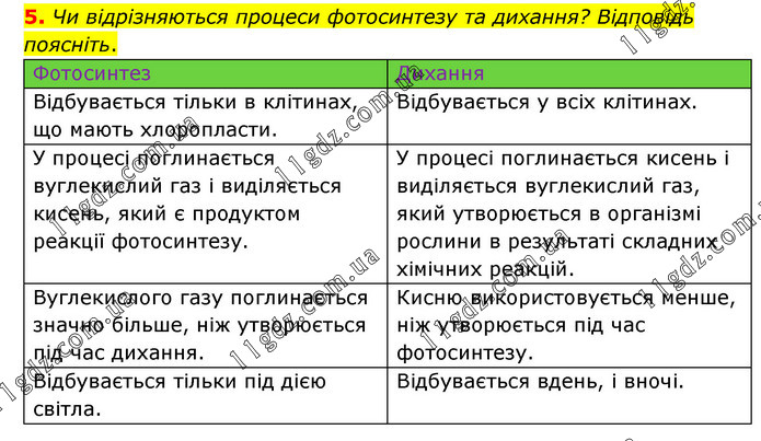 Чи відрізняються процеси фотосинтезу та дихання? Відповідь поясніть. Фотосинтез Дихання Відбувається тільки в клітинах, що мають хлоропласти. Відбувається у всіх клітинах. У процесі поглинається вуглекислий газ і виділяється кисень, який є продуктом реакції фотосинтезу. У процесі поглинається кисень і виділяється вуглекислий газ, який утворюється в організмі рослини в результаті складних хімічних реакцій. Вуглекислого газу поглинається значно більше, ніж утворюється під час дихання. Кисню використовується менше, ніж утворюється під час фотосинтезу. Відбувається тільки під дією світла. Відбувається вдень, і вночі.