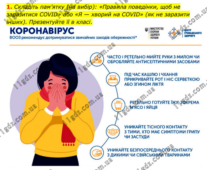 Складіть пам’ятку (на вибір): «Правила поведінки, щоб не заразитися COVID» або «Я — хворий на COVID» (як не заразити інших). Презентуйте її в класі.
