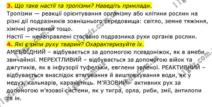 3. Що таке настії та тропізми? Наведіть приклади. Тропізми — реакції орієнтування організму або клітини рослин на різні дії подразників зовнішнього середовища: світло, земне тяжіння, хімічні речовини тощо. Настії — ненаправлені стосовно подразника рухи органів рослин. 4. Які є типи руху тварин? Охарактеризуйте їх. АМЕБОЇДНИЙ – відбувається за допомогою псевдоніжок, як в амеби звичайної. МЕРЕХТЛИВИЙ – відбувається за допомогою війок та джгутиків, як в інфузорії туфельки, евглени зеленої. РЕАКТИВНИЙ – відбувається внаслідок втягування й виштовхування води, як у медуз, кальмарів, каракатиць. М’ЯЗОВИЙ – активних рух за допомогою м’язової системи, як у тигра, орла, риби, змії, антилопи та ін.