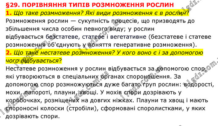 §29. ПОРІВНЯННЯ ТИПІВ РОЗМНОЖЕННЯ РОСЛИН 1. Що таке розмноження? Які види розмноження є в рослин? Розмноження рослин — сукупність процесів, що призводять до збільшення числа особин певного виду; у рослин відбувається безстатеве, статеве і вегетативне (безстатеве і статеве розмноження об'єднують у поняття генеративне розмноження). 2. Що таке нестатеве розмноження? У кого воно є і за допомогою чого відбувається? Нестатеве розмноження у рослин відбувається за допомогою спор, які утворюються в спеціальних органах спороношення. За допомогою спор розмножуються дуже багато груп рослин: водорості, мохи, папороті, плауни, хвощі. У мохів спори дозрівають у коробочках, розміщених на довгих ніжках. Плауни та хвощ і мають спороносні колоски (стробіли), сформовані споролистками, у яких дозрівають спори.