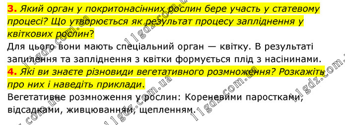 3. Який орган у покритонасінних рослин бере участь у статевому процесі? Що утворюється як результат процесу запліднення у квіткових рослин? Для цього вони мають спеціальний орган — квітку. В результаті запилення та запліднення з квітки формується плід з насінинами. 4. Які ви знаєте різновиди вегетативного розмноження? Розкажіть про них і наведіть приклади. Вегетативне розмноження у рослин: Кореневими паростками, відсадками, живцюванням, щепленням.