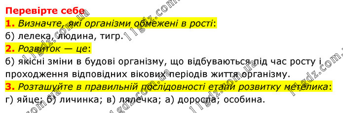 Перевірте себе 1. Визначте, які організми обмежені в рості: б) лелека, людина, тигр. 2. Розвиток — це: б) якісні зміни в будові організму, що відбуваються під час росту і проходження відповідних вікових періодів життя організму. 3. Розташуйте в правильній послідовності етапи розвитку метелика: г) яйце; б) личинка; в) лялечка; а) доросла; особина.