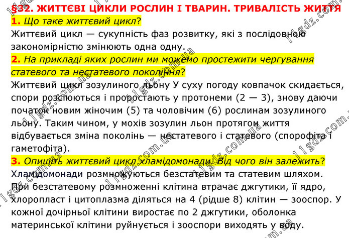 Перевірте себе 1. До вищих спорових рослин належать: б) гриби; в) мохи; г) хвойні. 2. Розташуйте в правильній послідовності етапи життєвого циклу медузи, починаючи від дорослої особини: а) поліп (нестатеве покоління); б) статеві клітини зливаються у воді; г) поліпи розмножуються брунькуванням; в) молода медуза. 3. Тривалість життя в якої особини найдовша? г) у секвої.