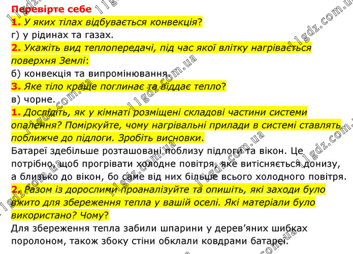 Перевірте себе 1. У яких тілах відбувається конвекція? г) у рідинах та газах. 2. Укажіть вид теплопередачі, під час якої влітку нагрівається поверхня Землі: б) конвекція та випромінювання. 3. Яке тіло краще поглинає та віддає тепло? в) чорне. 1. Дослідіть, як у кімнаті розміщені складові частини системи опалення? Поміркуйте, чому нагрівальні прилади в системі ставлять поближче до підлоги. Зробіть висновки. Батареї здебільше розташовані поблизу підлоги та вікон. Це потрібно, щоб прогрівати холодне повітря, яке витісняється донизу, а близько до вікон, бо саме від них більше всього холодного повітря. 2. Разом із дорослими проаналізуйте та опишіть, які заходи було вжито для збереження тепла у вашій оселі. Які матеріали було використано? Чому? Для збереження тепла забили шпарини у дерев’яних шибках поролоном, також збоку стіни обклали ковдрами батареї.