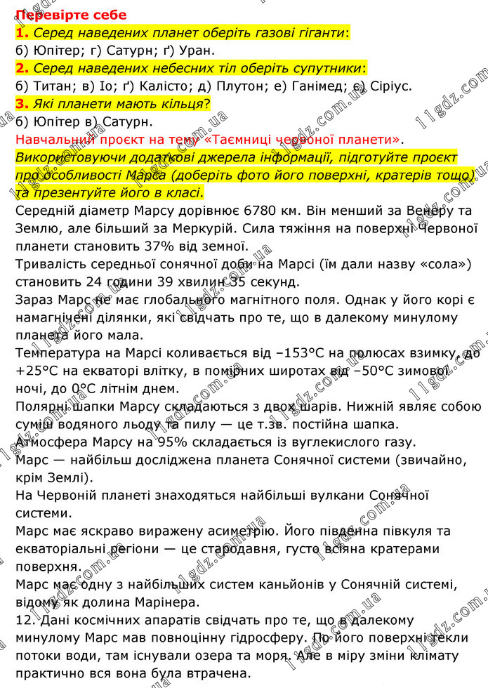 Перевірте себе 1. Серед наведених планет оберіть газові гіганти: б) Юпітер; г) Сатурн; ґ) Уран. 2. Серед наведених небесних тіл оберіть супутники: б) Титан; в) Іо; ґ) Калісто; д) Плутон; е) Ганімед; є) Сіріус. 3. Які планети мають кільця? б) Юпітер в) Сатурн. Навчальний проєкт на тему «Таємниці червоної планети». Використовуючи додаткові джерела інформації, підготуйте проєкт про особливості Марса (доберіть фото його поверхні, кратерів тощо) та презентуйте його в класі. Середній діаметр Марсу дорівнює 6780 км. Він менший за Венеру та Землю, але більший за Меркурій. Сила тяжіння на поверхні Червоної планети становить 37% від земної. Тривалість середньої сонячної доби на Марсі (їм дали назву «сола») становить 24 години 39 хвилин 35 секунд. Зараз Марс не має глобального магнітного поля. Однак у його корі є намагнічені ділянки, які свідчать про те, що в далекому минулому планета його мала. Температура на Марсі коливається від –153°C на полюсах взимку, до +25°C на екваторі влітку, в помірних широтах від –50°C зимової ночі, до 0°C літнім днем. Полярні шапки Марсу складаються з двох шарів. Нижній являє собою суміш водяного льоду та пилу — це т.зв. постійна шапка. Атмосфера Марсу на 95% складається із вуглекислого газу. Марс — найбільш досліджена планета Сонячної системи (звичайно, крім Землі). На Червоній планеті знаходяться найбільші вулкани Сонячної системи. Марс має яскраво виражену асиметрію. Його південна півкуля та екваторіальні регіони — це стародавня, густо всіяна кратерами поверхня. Марс має одну з найбільших систем каньйонів у Сонячній системі, відому як долина Марінера. 12. Дані космічних апаратів свідчать про те, що в далекому минулому Марс мав повноцінну гідросферу. По його поверхні текли потоки води, там існували озера та моря. Але в міру зміни клімату практично вся вона була втрачена.