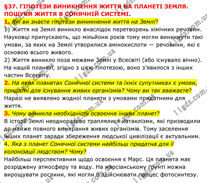 Перевірте себе 1. Наявність якої речовини на планеті може свідчити про існування на ній життя? б) води. 2. Яка планета є найбільш перспективною щодо її освоєння? г) Марс. 3. Яку планету вважали близнючкою Землі? а) Венеру. 1. Що ви знаєте про зникнення динозаврів 65 мільйонів років тому? Використовуючи інтернет–джерела, підготуйте коротке повідомлення про їхнє життя та зникнення. Масове вимирання динозаврів (та багатьох інших видів тварин і рослин) відбулося наприкінці крейдового періоду 65,5 млн років тому і мало стрімкий характер. За останніми науковими дослідженнями, це сталося внаслідок падіння гігантського астероїда, діаметром у 15 кілометрів. Кратер, утворений після падіння, був знайдений на території сучасної Мексики. Енергія удару астероїда об Землю в мільярд разів перевищувала енергію вибуху атомної бомби над Хіросімою.