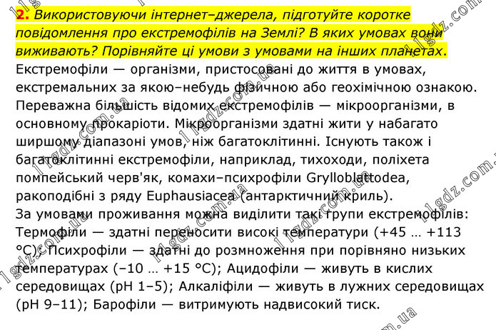 2. Використовуючи інтернет–джерела, підготуйте коротке повідомлення про екстремофілів на Землі? В яких умовах вони виживають? Порівняйте ці умови з умовами на інших планетах. Екстремофіли — організми, пристосовані до життя в умовах, екстремальних за якою–небудь фізичною або геохімічною ознакою. Переважна більшість відомих екстремофілів — мікроорганізми, в основному прокаріоти. Мікроорганізми здатні жити у набагато ширшому діапазоні умов, ніж багатоклітинні. Існують також і багатоклітинні екстремофіли, наприклад, тихоходи, поліхета помпейський черв'як, комахи–психрофіли Grylloblattodea, ракоподібні з ряду Euphausiacea (антарктичний криль). За умовами проживання можна виділити такі групи екстремофілів: Термофіли — здатні переносити високі температури (+45 … +113 °C); Психрофіли — здатні до розмноження при порівняно низьких температурах (–10 … +15 °C); Ацидофіли — живуть в кислих середовищах (pH 1–5); Алкаліфіли — живуть в лужних середовищах (pH 9–11); Барофіли — витримують надвисокий тиск.