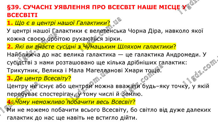 §39. СУЧАСНІ УЯВЛЕННЯ ПРО ВСЕСВІТ НАШЕ МІСЦЕ У ВСЕСВІТІ 1. Що є в центрі нашої Галактики? У центрі нашої Галактики є велетенська Чорна Діра, навколо якої кожна своєю орбітою рухаються зірки. 2. Які ви знаєте сусідні з Чумацьким Шляхом галактики? Найближча до нас велика галактика — це галактика Андромеди. У сусідстві з нами розташовано ще кілька дрібніших галактик: Трикутник, Велика і Мала Магелланові Хмари тощо. 3. Де центр Всесвіту? Центру не існує або центром можна вважати будь–яку точку, у якій перебуває спостерігач, у тому числі й Землю. 4. Чому неможливо побачити весь Всесвіт? Ми не можемо побачити всього Всесвіту, бо світло від дуже далеких галактик до нас ще навіть не встигло дійти.