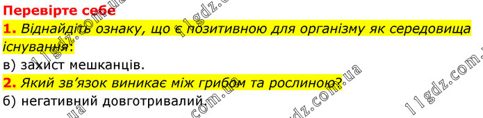 Перевірте себе 1. Віднайдіть ознаку, що є позитивною для організму як середовища існування: в) захист мешканців. 2. Який зв’язок виникає між грибом та рослиною? б) негативний довготривалий.