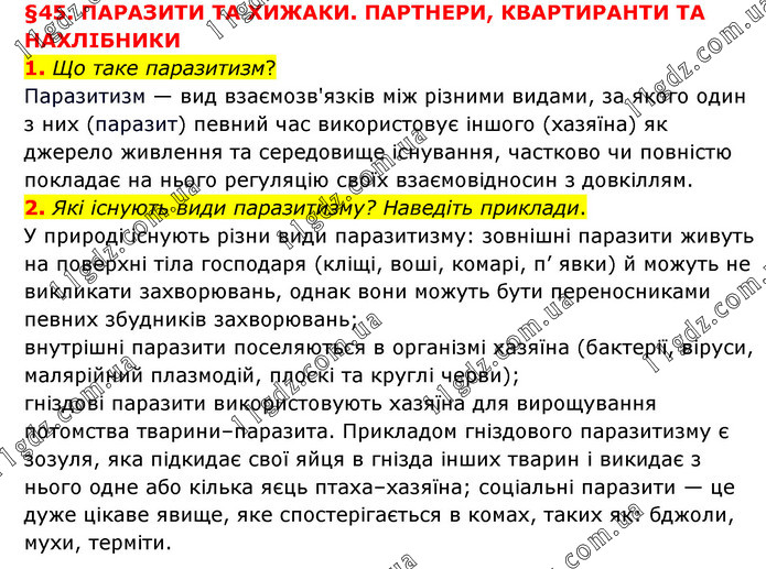 §45. ПАРАЗИТИ ТА ХИЖАКИ. ПАРТНЕРИ, КВАРТИРАНТИ ТА НАХЛІБНИКИ 1. Що таке паразитизм? Паразитизм — вид взаємозв'язків між різними видами, за якого один з них (паразит) певний час використовує іншого (хазяїна) як джерело живлення та середовище існування, частково чи повністю покладає на нього регуляцію своїх взаємовідносин з довкіллям. 2. Які існують види паразитизму? Наведіть приклади. У природі існують різни види паразитизму: зовнішні паразити живуть на поверхні тіла господаря (кліщі, воші, комарі, п’ явки) й можуть не викликати захворювань, однак вони можуть бути переносниками певних збудників захворювань; внутрішні паразити поселяються в організмі хазяїна (бактерії, віруси, малярійний плазмодій, плоскі та круглі черви); гніздові паразити використовують хазяїна для вирощування потомства тварини–паразита. Прикладом гніздового паразитизму є зозуля, яка підкидає свої яйця в гнізда інших тварин і викидає з нього одне або кілька яєць птаха–хазяїна; соціальні паразити — це дуже цікаве явище, яке спостерігається в комах, таких як: бджоли, мухи, терміти.