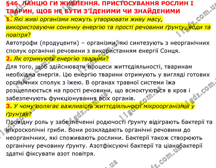 §46. ЛАНЦЮ ГИ ЖИВЛЕННЯ. ПРИСТОСУВАННЯ РОСЛИН І ТВАРИН, ЩОБ НЕ БУТИ З’ЇДЕНИМИ ЧИ ЗНАЙДЕНИМИ 1. Які живі організми можуть утворювати живу масу, використовуючи сонячну енергію та прості речовини ґрунту, води та повітря? Автотрофи (продуценти) – організми, які синтезують з неорганічних сполук органічні речовини з використанням енергії Сонця. 2. Як отримують енергію тварини? Для того, щоб здійснювати процеси життєдіяльності, тваринам необхідна енергія. Цю енергію тварини отримують у вигляді готових органічних сполук з їжею. В органах травної системи їжа розщеплюється на прості речовини, що всмоктуються в кров і забезпечують функціонування всіх органів. 3. У чому полягає важливість життєдіяльності мікроорганізмів у ґрунтах? Провідну роль у забезпеченні родючості ґрунту відіграють бактерії та мікроскопічні гриби. Вони розкладають органічні речовини до неорганічних, які споживають рослини. Бактерії також створюють органічну речовину ґрунту. Азотфіксуючі бактерії та ціанобактерії здатні фіксувати азот повітря.