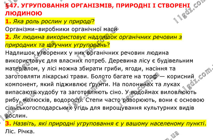 §47. УГРУПОВАННЯ ОРГАНІЗМІВ, ПРИРОДНІ І СТВОРЕНІ ЛЮДИНОЮ 1. Яка роль рослин у природі? Організми–виробники органічної маси 2. Як людина використовує надлишок органічних речовин з природних та штучних угруповань? Надлишок утворених у них органічних речовин людина використовує для власних потреб. Деревина лісу є будівельним матеріалом, у лісі можна збирати гриби, ягоди, насіння та заготовляти лікарські трави. Болото багате на торф — корисний компонент, який підживлює ґрунти. На полонинах та луках випасають худобу та заготовляють сіно. У водоймах виловлюють рибу, молюсків, водорості. Степи часто розорюють, вони є основою сільськогосподарських угідь для вирощування культурних видів рослин. 3. Назвіть, які природні угруповання є у вашому населеному пункті. Ліс. Річка.