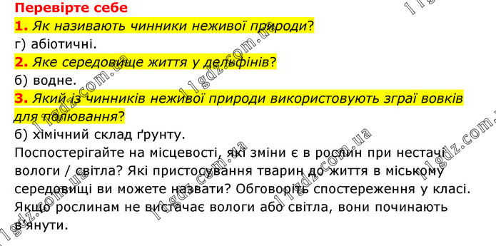 Перевірте себе 1. Як називають чинники неживої природи? г) абіотичні. 2. Яке середовище життя у дельфінів? б) водне. 3. Який із чинників неживої природи використовують зграї вовків для полювання? б) хімічний склад ґрунту. Поспостерігайте на місцевості, які зміни є в рослин при нестачі вологи / світла? Які пристосування тварин до життя в міському середовищі ви можете назвати? Обговоріть спостереження у класі. Якщо рослинам не вистачає вологи або світла, вони починають в’янути.