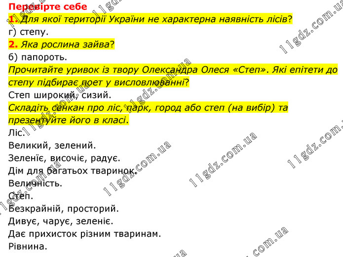 Перевірте себе 1. Для якої території України не характерна наявність лісів? г) степу. 2. Яка рослина зайва? б) папороть. Прочитайте уривок із твору Олександра Олеся «Степ». Які епітети до степу підбирає поет у висловлюванні? Степ широкий, сизий. Складіть сенкан про ліс, парк, город або степ (на вибір) та презентуйте його в класі. Ліс. Великий, зелений. Зеленїє, височіє, радує. Дім для багатьох тваринок. Величність. Степ. Безкрайній, просторий. Дивує, чарує, зеленіє. Дає прихисток різним тваринам. Рівнина.