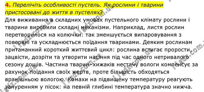 4. Перелічіть особливості пустель. Як рослини і тварини пристосовані до життя в пустелях? Для виживання в складних умовах пустельного клімату рослини і тварини виробили складні механізми. Наприклад, листя рослин перетворилося на колючки: так зменшується випаровування з поверхні та ускладнюється поїдання тваринами. Деяким рослинам притаманний короткий життєвий цикл: рослина встигає прорости, зацвісти, дозріти та утворити насіння під час одного нетривалого сезону дощів. Частина тварин–хижаків нестачу вологи компенсує за рахунок поїдання своїх жертв, проте більшість обходяться вранішньою вологою. Комахи на підвищену температуру реагують зануренням у пісок: на певній глибині температура значно нижча.