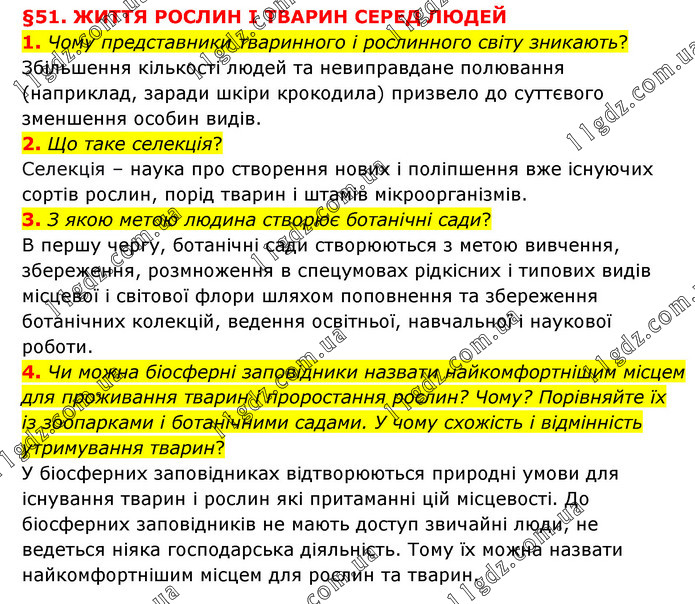 §51. ЖИТТЯ РОСЛИН І ТВАРИН СЕРЕД ЛЮДЕЙ 1. Чому представники тваринного і рослинного світу зникають? Збільшення кількості людей та невиправдане полювання (наприклад, заради шкіри крокодила) призвело до суттєвого зменшення особин видів. 2. Що таке селекція? Селекція – наука про створення нових і поліпшення вже існуючих сортів рослин, порід тварин і штамів мікроорганізмів. 3. З якою метою людина створює ботанічні сади? В першу чергу, ботанічні сади створюються з метою вивчення, збереження, розмноження в спецумовах рідкісних і типових видів місцевої і світової флори шляхом поповнення та збереження ботанічних колекцій, ведення освітньої, навчальної і наукової роботи. 4. Чи можна біосферні заповідники назвати найкомфортнішим місцем для проживання тварин і проростання рослин? Чому? Порівняйте їх із зоопарками і ботанічними садами. У чому схожість і відмінність утримування тварин? У біосферних заповідниках відтворюються природні умови для існування тварин і рослин які притаманні цій місцевості. До біосферних заповідників не мають доступ звичайні люди, не ведеться ніяка господарська діяльність. Тому їх можна назвати найкомфортнішим місцем для рослин та тварин.