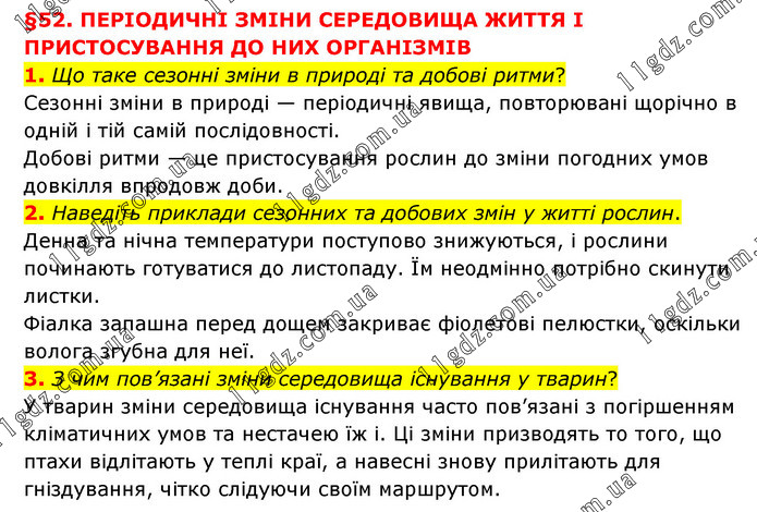 §52. ПЕРІОДИЧНІ ЗМІНИ СЕРЕДОВИЩА ЖИТТЯ І ПРИСТОСУВАННЯ ДО НИХ ОРГАНІЗМІВ 1. Що таке сезонні зміни в природі та добові ритми? Сезонні зміни в природі — періодичні явища, повторювані щорічно в одній і тій самій послідовності. Добові ритми — це пристосування рослин до зміни погодних умов довкілля впродовж доби. 2. Наведіть приклади сезонних та добових змін у житті рослин. Денна та нічна температури поступово знижуються, і рослини починають готуватися до листопаду. Їм неодмінно потрібно скинути листки. Фіалка запашна перед дощем закриває фіолетові пелюстки, оскільки волога згубна для неї. 3. З чим пов’язані зміни середовища існування у тварин? У тварин зміни середовища існування часто пов’язані з погіршенням кліматичних умов та нестачею їж і. Ці зміни призводять то того, що птахи відлітають у теплі краї, а навесні знову прилітають для гніздування, чітко слідуючи своїм маршрутом.
