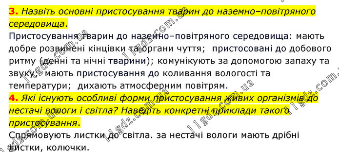 3. Назвіть основні пристосування тварин до наземно–повітряного середовища. Пристосування тварин до наземно–повітряного середовища: мають добре розвинені кінцівки та органи чуття; пристосовані до добового ритму (денні та нічні тварини); комунікують за допомогою запаху та звуку; мають пристосування до коливання вологості та температури; дихають атмосферним повітрям. 4. Які існують особливі форми пристосування живих організмів до нестачі вологи і світла? Наведіть конкретні приклади такого пристосування. Спрямовують листки до світла. за нестачі вологи мають дрібні листки, колючки.
