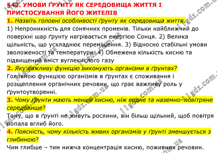 §43. УМОВИ ҐРУНТУ ЯК СЕРЕДОВИЩА ЖИТТЯ І ПРИСТОСУВАННЯ ЙОГО ЖИТЕЛІВ 1. Назвіть головні особливості ґрунту як середовища життя. 1) Непроникність для сонячних променів. Тільки найближчий до поверхні шар ґрунту нагрівається енергією Сонця. 2) Велика щільність, що ускладнює переміщення. 3) Відносно стабільні умови зволоженості та температури. 4) Обмежена кількість кисню та підвищений вміст вуглекислого газу 2. Яку важливу функцію виконують організми в ґрунтах? Головною функцією організмів в ґрунтах є споживання і розщеплення органічних речовин, що грає важливу роль у ґрунтоутворенні. 3. Чому ґрунти мають менше кисню, ніж водне та наземно–повітряне середовище? Тому, що в ґрунті не живуть рослини, він більш щільний, щоб повітря попала вглиб його. 4. Поясність, чому кількість живих організмів у ґрунті зменшується з глибиною? Чим глибше – тим нижча концентрація кисню, поживних речовин.