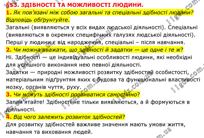 §53. ЗДІБНОСТІ ТА МОЖЛИВОСТІ ЛЮДИНИ. 1. Як пов’язані між собою загальні та спеціальні здібності людини? Відповідь обґрунтуйте. Загальні (виявляються у всіх видах людської діяльності). Спеціальні (виявляються в окремих специфічних галузях людської діяльності). Перші у людини є від народження, спеціальні – після навчання. 2. Чи можна вважати, що здібності й задатки — це одне і те ж? Ні. Здібності — це індивідуальні особливості людини, які необхідні для успішного виконання нею певної діяльності. Задатки — природні можливості розвитку здібностей особистості, матеріальним підґрунтям яких є будова та функціональні властивості мозку, органів чуття, руху. 3. Чи можуть здібності розвиватися самостійно? Запам’ятайте! Здібності не тільки виявляються, а й формуються в діяльності. 4. Від чого залежить розвиток здібностей? Для розвитку здібностей важливе значення мають умови життя, навчання та виховання людей.