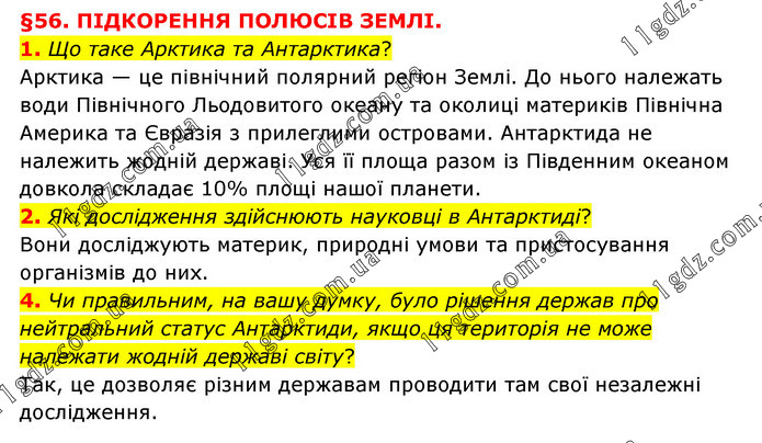 §56. ПІДКОРЕННЯ ПОЛЮСІВ ЗЕМЛІ. 1. Що таке Арктика та Антарктика? Арктика — це північний полярний регіон Землі. До нього належать води Північного Льодовитого океану та околиці материків Північна Америка та Євразія з прилеглими островами. Антарктида не належить жодній державі. Уся її площа разом із Південним океаном довкола складає 10% площі нашої планети. 2. Які дослідження здійснюють науковці в Антарктиді? Вони досліджують материк, природні умови та пристосування організмів до них. 4. Чи правильним, на вашу думку, було рішення держав про нейтральний статус Антарктиди, якщо ця територія не може належати жодній державі світу? Так, це дозволяє різним державам проводити там свої незалежні дослідження.