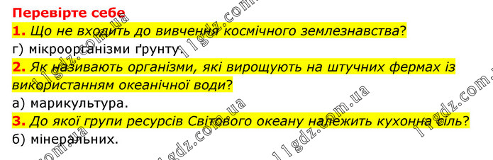 Перевірте себе 1. Що не входить до вивчення космічного землезнавства? г) мікроорганізми ґрунту. 2. Як називають організми, які вирощують на штучних фермах із використанням океанічної води? а) марикультура. 3. До якої групи ресурсів Світового океану належить кухонна сіль? б) мінеральних.