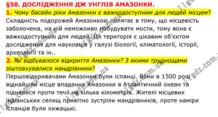 §58. ДОСЛІДЖЕННЯ ДЖ УНГЛІВ АМАЗОНКИ. 1. Чому басейн ріки Амазонки є важкодоступним для людей місцем? Складність подорожей Амазонкою полягає в тому, що місцевість заболочена, на ній неможливо побудувати мости, тому вона є важкодоступною для людей. Ця територія є цікавим об'єктом дослідження для науковців у галузі біології, кліматології, історії, археології та ін.. 2. Як відбувалося відкриття Амазонки? З якими труднощами зіштовхувалися мандрівники? Першовідкривачами Амазонки були іспанці. Вони в 1500 році віднайшли місце впадання Амазонки в Атлантичний океан та піднялися проти течії на кілька кілометрів. Жителі місцевих індіанських селищ привітно зустріли мандрівників, проте наміри іспанців були хижацькі.