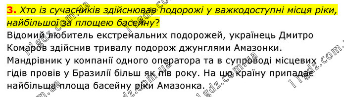 3. Хто із сучасників здійснював подорожі у важкодоступні місця ріки, найбільшої за площею басейну? Відомий любитель екстремальних подорожей, українець Дмитро Комаров здійснив тривалу подорож джунглями Амазонки. Мандрівник у компанії одного оператора та в супроводі місцевих гідів провів у Бразилії більш як пів року. На цю країну припадає найбільша площа басейну ріки Амазонка.