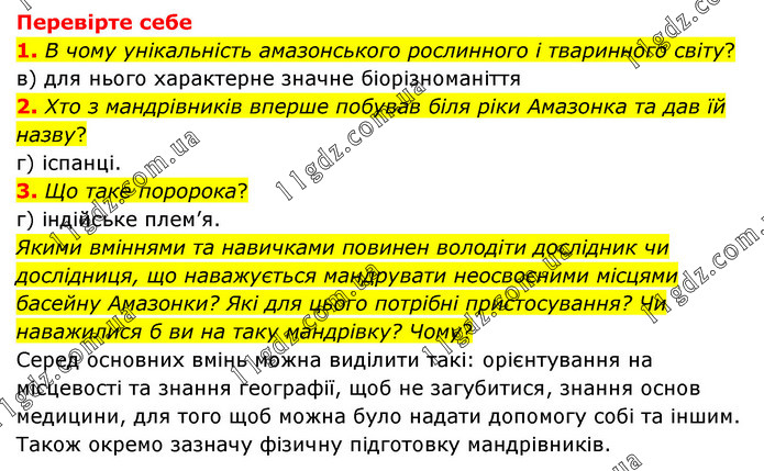 Перевірте себе 1. В чому унікальність амазонського рослинного і тваринного світу? в) для нього характерне значне біорізноманіття 2. Хто з мандрівників вперше побував біля ріки Амазонка та дав їй назву? г) іспанці. 3. Що таке поророка? г) індійське плем’я. Якими вміннями та навичками повинен володіти дослідник чи дослідниця, що наважується мандрувати неосвоєними місцями басейну Амазонки? Які для цього потрібні пристосування? Чи наважилися б ви на таку мандрівку? Чому? Серед основних вмінь можна виділити такі: орієнтування на місцевості та знання географії, щоб не загубитися, знання основ медицини, для того щоб можна було надати допомогу собі та іншим. Також окремо зазначу фізичну підготовку мандрівників.
