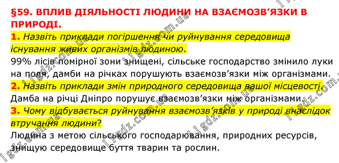 §59. ВПЛИВ ДІЯЛЬНОСТІ ЛЮДИНИ НА ВЗАЄМОЗВ’ЯЗКИ В ПРИРОДІ. 1. Назвіть приклади погіршення чи руйнування середовища існування живих організмів людиною. 99% лісів помірної зони знищені, сільське господарство змінило луки на поля, дамби на річках порушують взаємозв’язки між організмами. 2. Назвіть приклади змін природного середовища вашої місцевості. Дамба на річці Дніпро порушує взаємозв’язки між організмами. 3. Чому відбувається руйнування взаємозв’язків у природі внаслідок втручання людини? Людина з метою сільського господарювання, природних ресурсів, знищую середовище буття тварин та рослин.