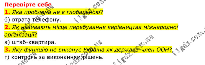 Перевірте себе 1. Яка проблема не є глобальною? б) втрата телефону. 2. Як називають місце перебування керівництва міжнародної організації? а) штаб-квартира. 3. Яку функцію не виконує Україна як держава-член ООН? г) контроль за виконанням рішень.
