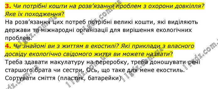 3. Чи потрібні кошти на розв’язання проблем з охорони довкілля? Яке їх походження? На розв’язання цих потреб потрібні великі кошти, які виділяють держави та міжнародні організації для вирішення екологічних проблем. 4. Чи знайомі ви з життям в екостилі? Які приклади з власного досвіду екологічно свідомого життя ви можете назвати? Треба здавати макулатуру на переробку, треба доношувати речі старшого брата чи сестри. Ось, що таке для мене екостиль. Сортувати сміття (пластик, батарейки)