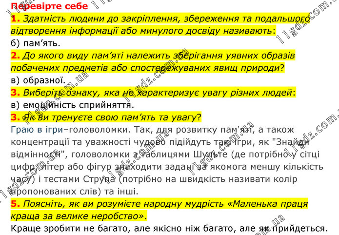 Перевірте себе 1. Здатність людини до закріплення, збереження та подальшого відтворення інформації або минулого досвіду називають: б) пам’ять. 2. До якого виду пам’яті належить зберігання уявних образів побачених предметів або спостережуваних явищ природи? в) образної. 3. Виберіть ознаку, яка не характеризує увагу різних людей: в) емоційність сприйняття. 3. Як ви тренуєте свою пам’ять та увагу? Граю в ігри–головоломки. Так, для розвитку пам'яті, а також концентрації та уважності чудово підійдуть такі ігри, як "Знайди відмінності", головоломки з таблицями Шульте (де потрібно у сітці цифр, літер або фігур знаходити задані за якомога меншу кількість часу) і тестами Струпа (потрібно на швидкість називати колір пропонованих слів) та інші. 5. Поясніть, як ви розумієте народну мудрість «Маленька праця краща за велике неробство». Краще зробити не багато, але якісно ніж багато, але як прийдеться.