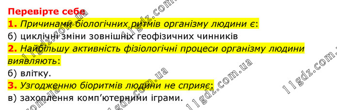 Перевірте себе 1. Причинами біологічних ритмів організму людини є: б) циклічні зміни зовнішніх геофізичних чинників 2. Найбільшу активність фізіологічні процеси організму людини виявляють: б) влітку. 3. Узгодженню біоритмів людини не сприяє: в) захоплення комп’ютерними іграми.