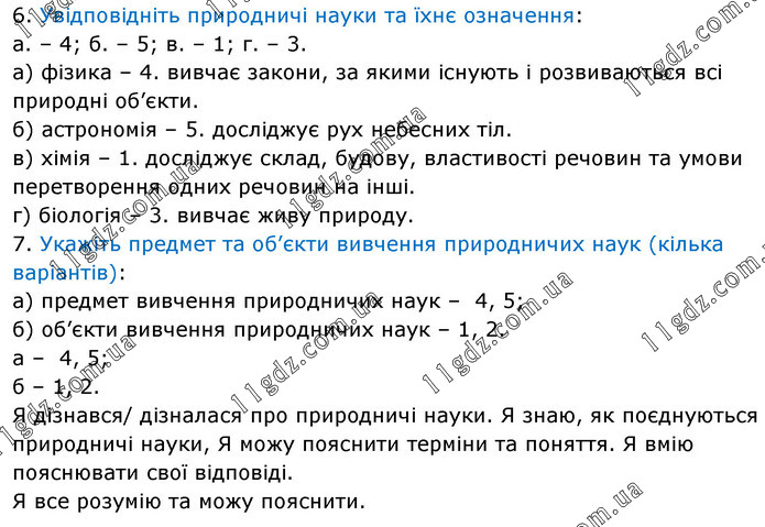 6. Увідповідніть природничі науки та їхнє означення: а. – 4; б. – 5; в. – 1; г. – 3. а) фізика – 4. вивчає закони, за якими існують і розвиваються всі природні об’єкти. б) астрономія – 5. досліджує рух небесних тіл. в) хімія – 1. досліджує склад, будову, властивості речовин та умови перетворення одних речовин на інші. г) біологія – 3. вивчає живу природу. 7. Укажіть предмет та об’єкти вивчення природничих наук (кілька варіантів): а) предмет вивчення природничих наук – 4, 5; б) об’єкти вивчення природничих наук – 1, 2. а – 4, 5; б – 1, 2. Я дізнався/ дізналася про природничі науки. Я знаю, як поєднуються природничі науки, Я можу пояснити терміни та поняття. Я вмію пояснювати свої відповіді. Я все розумію та можу пояснити.