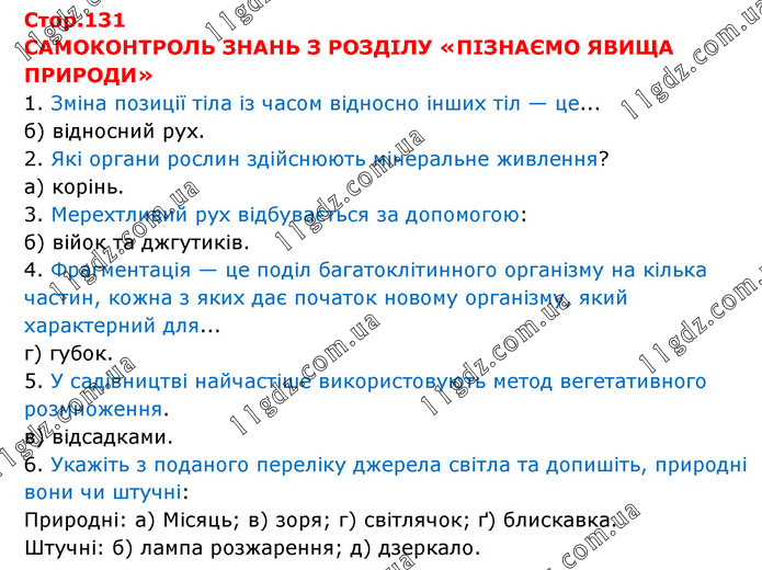 САМОКОНТРОЛЬ ЗНАНЬ З РОЗДІЛУ «ПІЗНАЄМО ЯВИЩА ПРИРОДИ» 1. Зміна позиції тіла із часом відносно інших тіл — це... б) відносний рух. 2. Які органи рослин здійснюють мінеральне живлення? а) корінь. 3. Мерехтливий рух відбувається за допомогою: б) війок та джгутиків. 4. Фрагментація — це поділ багатоклітинного організму на кілька частин, кожна з яких дає початок новому організму, який характерний для... г) губок. 5. У садівництві найчастіше використовують метод вегетативного розмноження. в) відсадками. 6. Укажіть з поданого переліку джерела світла та допишіть, природні вони чи штучні: Природні: а) Місяць; в) зоря; г) світлячок; ґ) блискавка. Штучні: б) лампа розжарення; д) дзеркало.