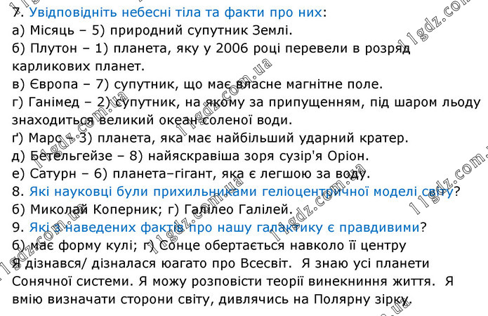7. Увідповідніть небесні тіла та факти про них: а) Місяць – 5) природний супутник Землі. б) Плутон – 1) планета, яку у 2006 році перевели в розряд карликових планет. в) Європа – 7) супутник, що має власне магнітне поле. г) Ганімед – 2) супутник, на якому за припущенням, під шаром льоду знаходиться великий океан соленої води. ґ) Марс – 3) планета, яка має найбільший ударний кратер. д) Бетельгейзе – 8) найяскравіша зоря сузір'я Оріон. е) Сатурн – 6) планета–гігант, яка є легшою за воду. 8. Які науковці були прихильниками геліоцентричної моделі світу? б) Миколай Коперник; г) Галілео Галілей. 9. Які з наведених фактів про нашу галактику є правдивими? б) має форму кулі; г) Сонце обертається навколо її центру Я дізнався/ дізналася юагато про Всесвіт. Я знаю усі планети Сонячної системи. Я можу розповісти теорії винекниння життя. Я вмію визначати сторони світу, дивлячись на Полярну зірку.