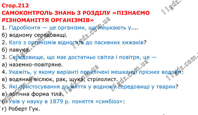 САМОКОНТРОЛЬ ЗНАНЬ З РОЗДІЛУ «ПІЗНАЄМО РІЗНОМАНІТТЯ ОРГАНІЗМІВ» 1. Гідробіонти — це організми, що мешкають у.... б) водному середовищі. 2. Кого з організмів відносять до пасивних хижаків? б) павука. 3. Середовище, що має достатньо світла і повітря, це — а) наземно-повітряне. 4. Укажіть, у якому варіанті перелічені мешканці прісних водойм: в) водяний віслюк, рак, щука, стрілолист. 5. Які пристосування до життя у водному середовищі у тварин? в) обтічна форма тіла. 6. Увів у науку в 1879 р. поняття «симбіоз»: г) Роберт Гук.