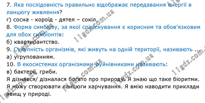 7. Яка послідовність правильно відображає передавання енергії в ланцюгу живлення? г) сосна - короїд - дятел – сокіл. 8. Форма симбіозу, за якої співіснування є корисним та обов’язковим для обох симбіонтів: б) квартирантство. 9. Сукупність організмів, які живуть на одній території, називають ... а) угрупованням. 10. В екосистемах організмами-руйнівниками називають: в) бактерії, гриби. Я дізнався/ дізналася богато про природу. Я знаю що таке біоритми. Я можу створювати ланцюги харчування. Я вмію наводити приклади явищ у природі.