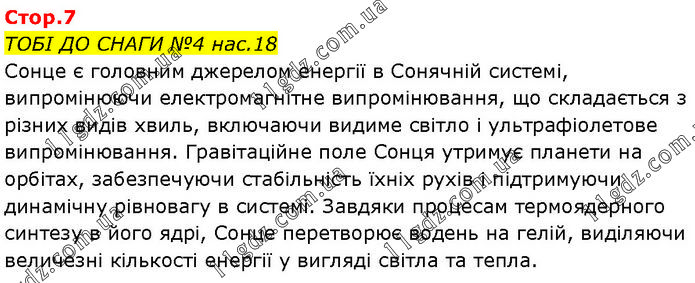ТОБІ ДО СНАГИ №4 нас.18 Сонце є головним джерелом енергії в Сонячній системі, випромінюючи електромагнітне випромінювання, що складається з різних видів хвиль, включаючи видиме світло і ультрафіолетове випромінювання. Гравітаційне поле Сонця утримує планети на орбітах, забезпечуючи стабільність їхніх рухів і підтримуючи динамічну рівновагу в системі. Завдяки процесам термоядерного синтезу в його ядрі, Сонце перетворює водень на гелій, виділяючи величезні кількості енергії у вигляді світла та тепла.