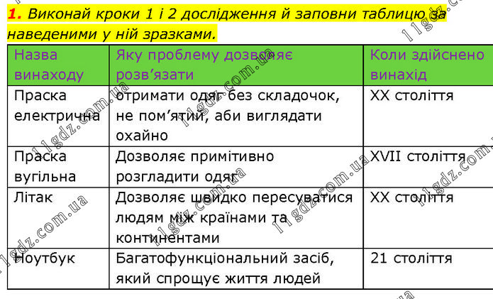 Виконай кроки 1 і 2 дослідження й заповни таблицю за наведеними у ній зразками. Назва винаходу Яку проблему дозволяє розв’язати Коли здійснено винахід Праска електрична отримати одяг без складочок, не пом’ятий, аби виглядати охайно XX століття Праска вугільна Дозволяє примітивно розгладити одяг XVII століття Літак Дозволяє швидко пересуватися людям між країнами та континентами XX століття Ноутбук Багатофункціональний засіб, який спрощує життя людей 21 століття