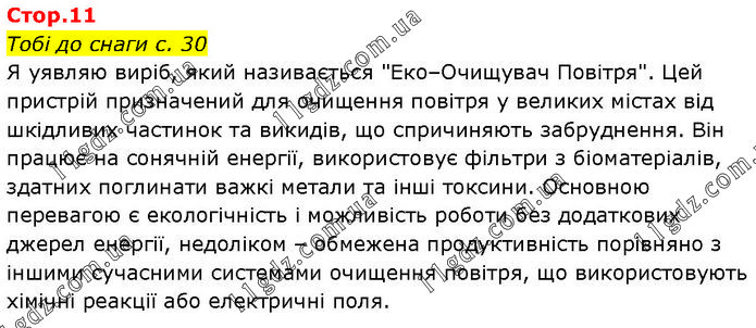 Тобі до снаги с. 30 Я уявляю виріб, який називається "Еко–Очищувач Повітря". Цей пристрій призначений для очищення повітря у великих містах від шкідливих частинок та викидів, що спричиняють забруднення. Він працює на сонячній енергії, використовує фільтри з біоматеріалів, здатних поглинати важкі метали та інші токсини. Основною перевагою є екологічність і можливість роботи без додаткових джерел енергії, недоліком – обмежена продуктивність порівняно з іншими сучасними системами очищення повітря, що використовують хімічні реакції або електричні поля.